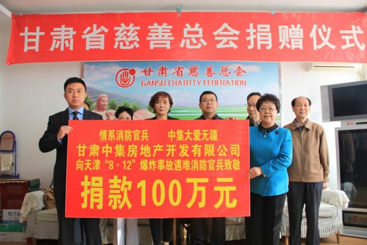 2015年8月12日23時(shí)30分,天津?yàn)I海新區(qū)國際物流中心發(fā)生重大爆炸火災(zāi)事故,造成重大人員傷亡。甘肅中集房地產(chǎn)開發(fā)有限公司總經(jīng)理周啟濤獲悉后,決定為在本次事故中犧牲的消防官兵及其家屬捐款100萬元,用于幫助犧牲消防官兵家屬善后事宜的處理,以盡一份甘肅企業(yè)的慈善愛心。