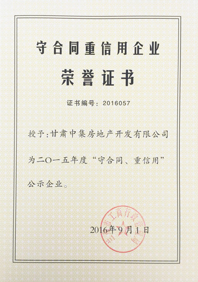 2016年9月1日,由蘭州市工商行政管理局評選的蘭州市2015年度“守合同重信用公示企業(yè)”對社會各界發(fā)布,本次全蘭州市共發(fā)布88個“守合同重信用公示企業(yè)”。甘肅中集實業(yè)集團(tuán)有限公司子公司甘肅中集房地產(chǎn)開發(fā)有限公司憑借“重誠信、謀發(fā)展”的經(jīng)營發(fā)展模式,喜獲蘭州市2015年度“守合同重信用公示企業(yè)”榮譽(yù)稱號,為甘肅中集集團(tuán)發(fā)展里程再添輝煌。